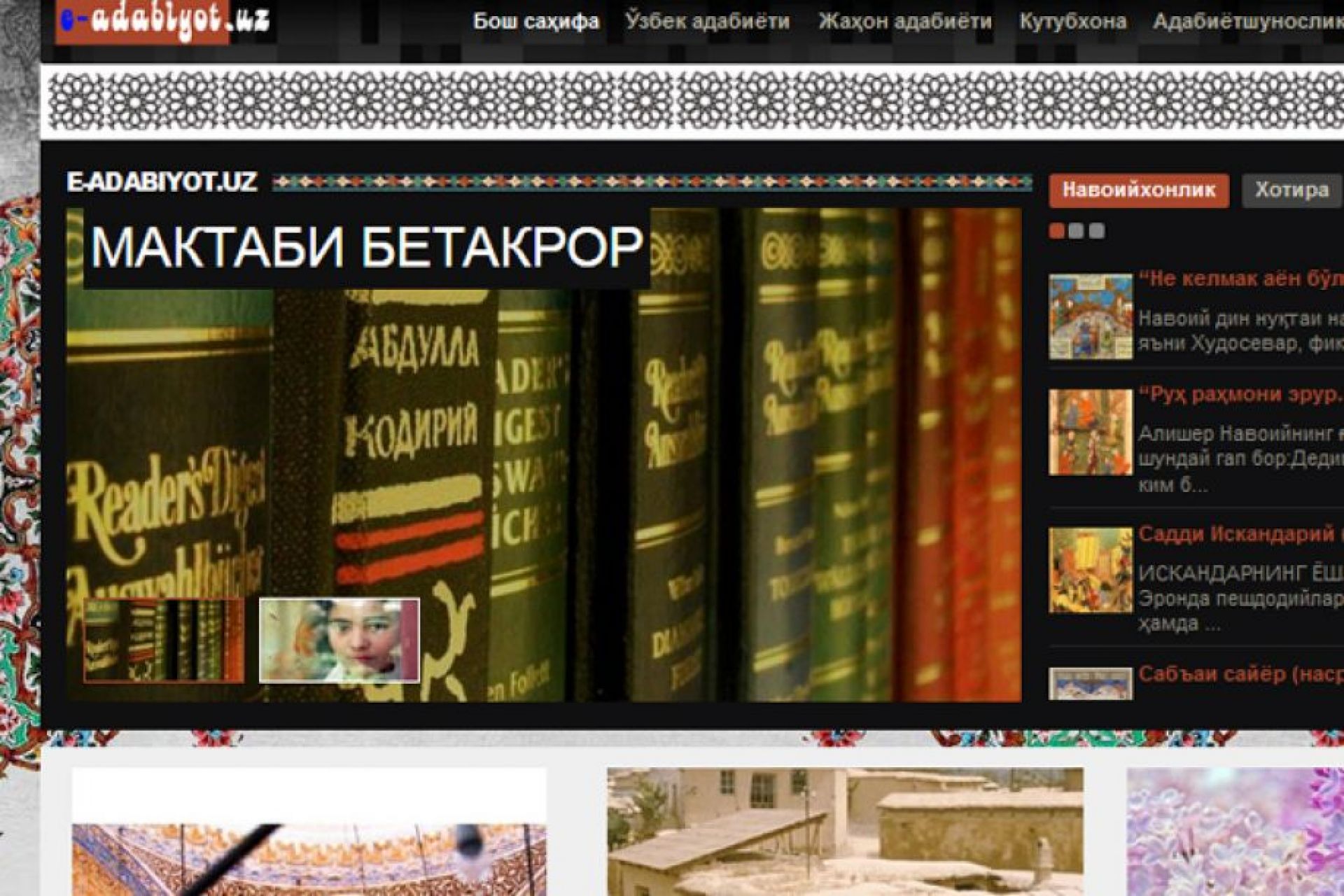 Сайт бош саҳифасини очарканман, ундаги рукнлар, мавзулар хилма-хиллигини кўриб кўзим ўйнади, қайси биридан бошлашни билмай ақлим шошди. Ўзингиз тасаввур қилинг: «Ўзбек адабиёти»ми ёки «Жаҳон адабиёти»? «Кутубхона»га кириб кўрсаммикин ёки олдин «Адабиётшунослик» билан танишсаммикин?