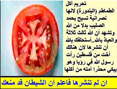 “Помидорларни (томатларни) истеъмол қилиш тақиқланади, чунки улар насронийларники ва улар Аллоҳга ҳамду сано айтиш ўрнига хочни (насронийларнинг учлик ақидасини) мадҳ қилишмоқда, наъузибиллаҳ”. Гўёки тушида Пайғамбаримиз (с.а.в)ни кўрган фаластинлик синглимиз: Пайғамбаримизни йиғлаб, умматни помидор истеъмол қилишидан огоҳлантирганини айтиб чиқди. “Аллоҳ учун буни одамларга етказинг”, - деб даъват қилди.