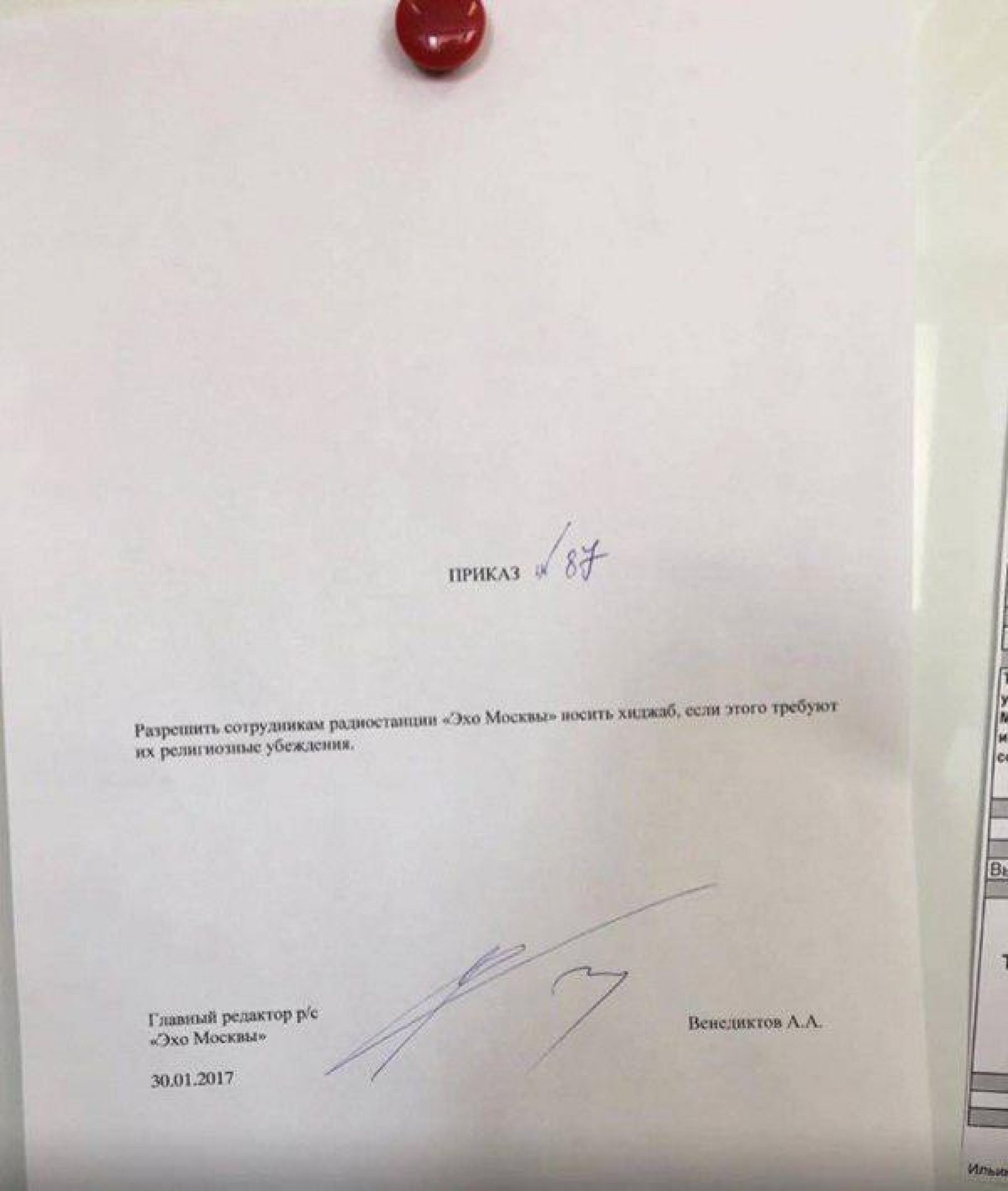 «Эхо Москвы» радио станцияни бош муҳаррири Алексей Венедиктов таҳририятдаги жуда кўп мунозарадан кейин ходимларга ҳижоб кийиб ишлашга рухсат беришга мажбур бўлгинини ўз Тwиттер сахифасида ёзган.