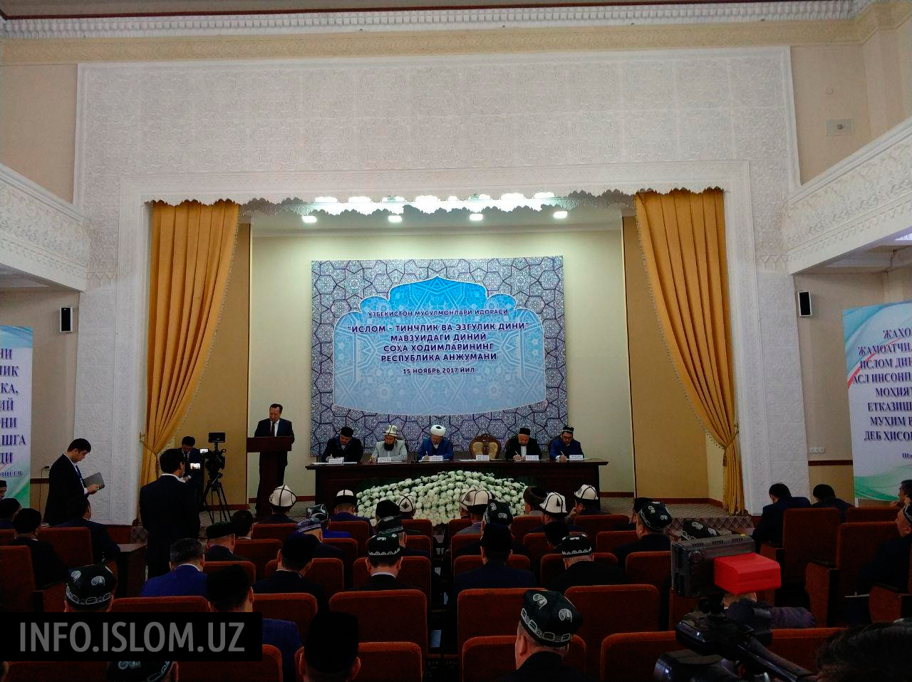 Анжуманда Муфтий Усмонхон Алимов, Диний қўмита раиси Ортиқбек Юсупов, Тошкент шаҳар бош имом хатиби Анвар қори Турсунов ва вилоятлар бош имом хатиблари, диний арбоблар ва соха мутахассислари иштирок этишмоқда.