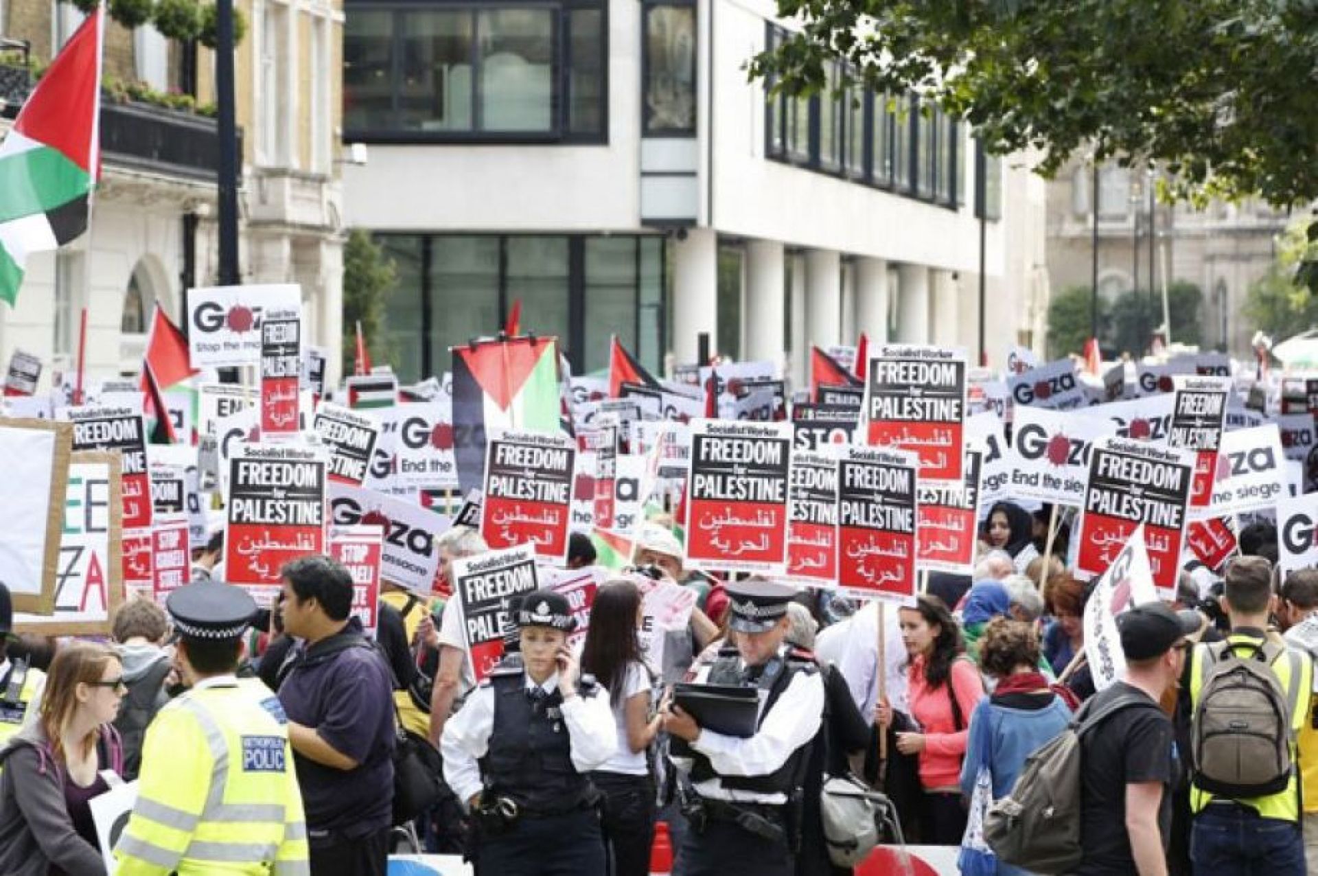 “The Middle East Monitor”нинг хабар беришича, 2014 йил 9 август шанба куни Британия пойтахти Лондон кўчалари бўйлаб ўн минглаб одамлар Ғазода Исроил армиясининг хужумларидан қурбон бўлаётган минглаб тинч аҳоли вакиллари, шу жумладан болалар ва аёлларни ҳимоя қилишга чорлаб намойиш ўтказганлар.